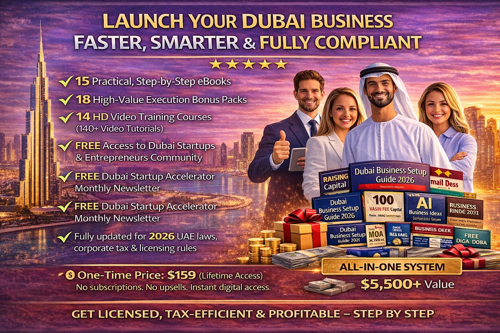 🎯 🚀 Dubai Business Setup Academy – 2026 Edition : Built for Founders, Expats, Freelancers & Entrepreneurs. The Complete Education + Execution System to Start, Structure, Fund & Scale a Business in Dubai and the UAE — the right way - ✔ 15 Practical, Step-by-Step eBooks, ✔ 18 High-Value Execution Bonus Packs, ✔ 14 HD Video Training Courses (140+ Video Tutorials), ✔ FREE Access to Dubai Startups & Entrepreneurs Community, ✔ FREE Dubai Startup Accelerator Monthly Newsletter and ✔ Fully updated for 2026 UAE laws, corporate tax & licensing rules. For only 💰 One-Time Price: $159 (Lifetime Access). No subscriptions. No upsells. Instant digital access.